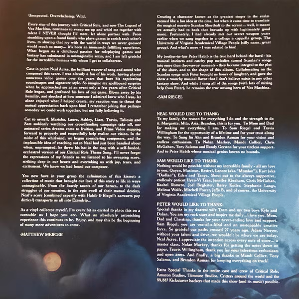 Além das faixas orquestrais grandiosas, o LP inclui músicas exclusivas como “Pull My Beads of Love (Extended Version)” e “Dragons”, que expandem ainda mais o universo musical da produção. Cada faixa conduz o ouvinte por uma jornada entre batalhas, magia, humor e emoção, capturando perfeitamente o espírito aventureiro e irreverente de Vox Machina.