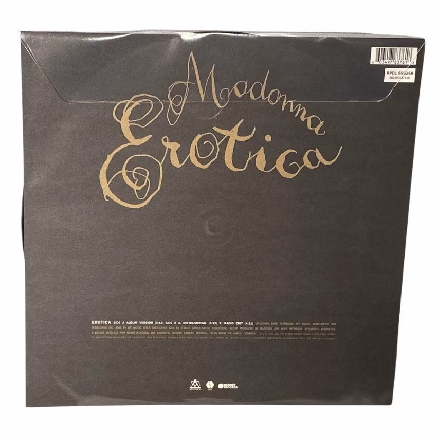 Lançado em 1992, Erotica é o quinto álbum de estúdio de Madonna e um marco audacioso em sua carreira, misturando música dançante com temas provocativos e sensuais. O disco estreou no topo das paradas mundiais e ultrapassou seis milhões de cópias vendidas, consolidando-se como uma das obras mais ousadas do pop. Em comemoração aos 30 anos do álbum, foi lançado um picture vinyl com a faixa-título, cuja edição original havia sido cancelada em 1992 por causa de sua imagem considerada explícita. Com apenas poucas cópias sobreviventes na época, o item se tornou um símbolo cult entre os fãs. Agora, após três décadas, essa edição rara ressurge oficialmente, mantendo viva a provocação e a estética marcante de Madonna.