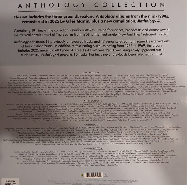 Lançado em novembro de 2025, o Anthology Collection é a edição definitiva em vinil do projeto mais ambicioso já dedicado ao catálogo dos Beatles. O box reúne, em 12 LPs (4 álbuns triplos), uma ampla seleção de demos, takes alternativos, gravações inéditas, jams de estúdio, diálogos e versões de trabalho, cobrindo toda a trajetória do grupo, do início em Liverpool até os últimos dias da banda.